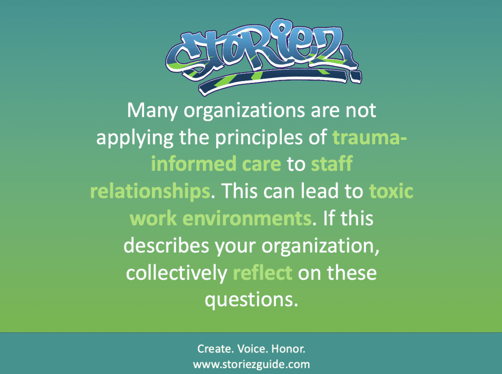 This is baffling. We know that 80% of people in the US have experienced trauma (Courtois, 2014). This includes not only our clients and community members, but staff and administrators as well. Many organizations do an excellent job of applying the principles of trauma-informed care to their interactions with clients, but when it comes to staff interactions, the work environment is toxic.